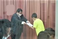 今日の全校集会では、ノシャップロードレースで3位までに入った子どもたちの表彰式を行いました。