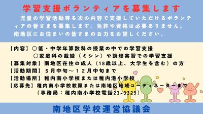 南地区学校運営協議会では、南小学校か港小学校で児童の学習活動を支援していただける学習支援ボランティアの皆さまを募集します。低・中学年の算数科の授業や高学年の家庭科(裁縫や調理実習)の授業において、児童の困りごとのサポートをしていただく内容となります。専門的な知識や技能は必要ありません。算数科の学習支援については週1回でも結構です。家庭科の学習支援については授業を実施する際に学校側よりご連絡いたします。南地区在住の成人(18歳以上)の方が対象となります。詳細については事務局担当の南小学校 教頭までお電話をくださいますよう、お願いします。