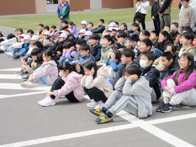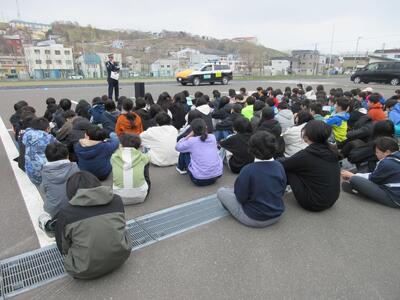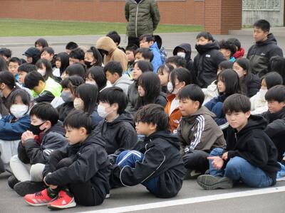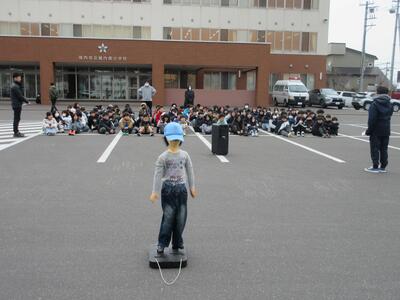 3・4年生と5・6年生を対象に、交通安全教室を実施しました。稚内市役所や稚内警察署の方々にご来校いただき、指導していただきました。ダミー人形を使った事故の実験を見た後、交通ルールを守ることの大切さや、自転車の乗り方について、丁寧にお話しいただきました。時速50kmで走行する車と衝突した際の衝撃の大きさには、子どもたちも驚いている様子でした。とても寒い中での実施でしたが、子どもたちは最後まで真剣に話を聞くことができました。最後には、各学級の代表が感想を発表し、学びを交流しました。家族が悲しむことのないよう、「自分の命は自分で守る」という意識をもち、これからも周りをよく見て安全に行動してほしいと思います。