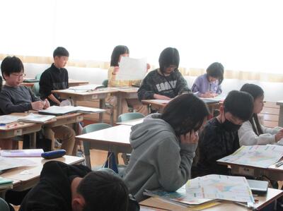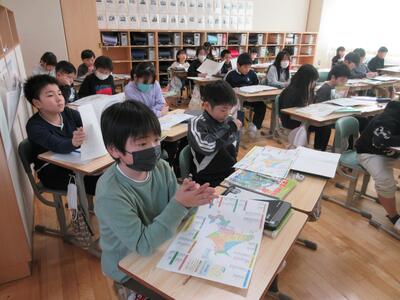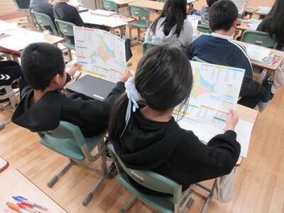 4年生が国語の授業で、図書館のオリエンテーションも兼ねて学習しました。本の分類について学んだり、クイズの答えを本から探したりする活動に取り組みました。子どもたちは、問題に答えようと熱心に、そして楽しそうに取り組んでいました。社会の授業では、北海道にどのような市町村があるのかを、地図を見ながら学習しました。自分たちの住む稚内市が宗谷管内にあることも確認することができました。